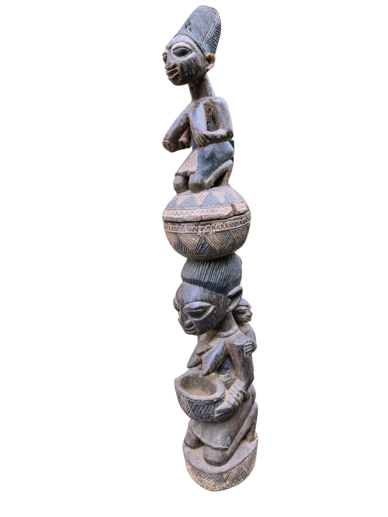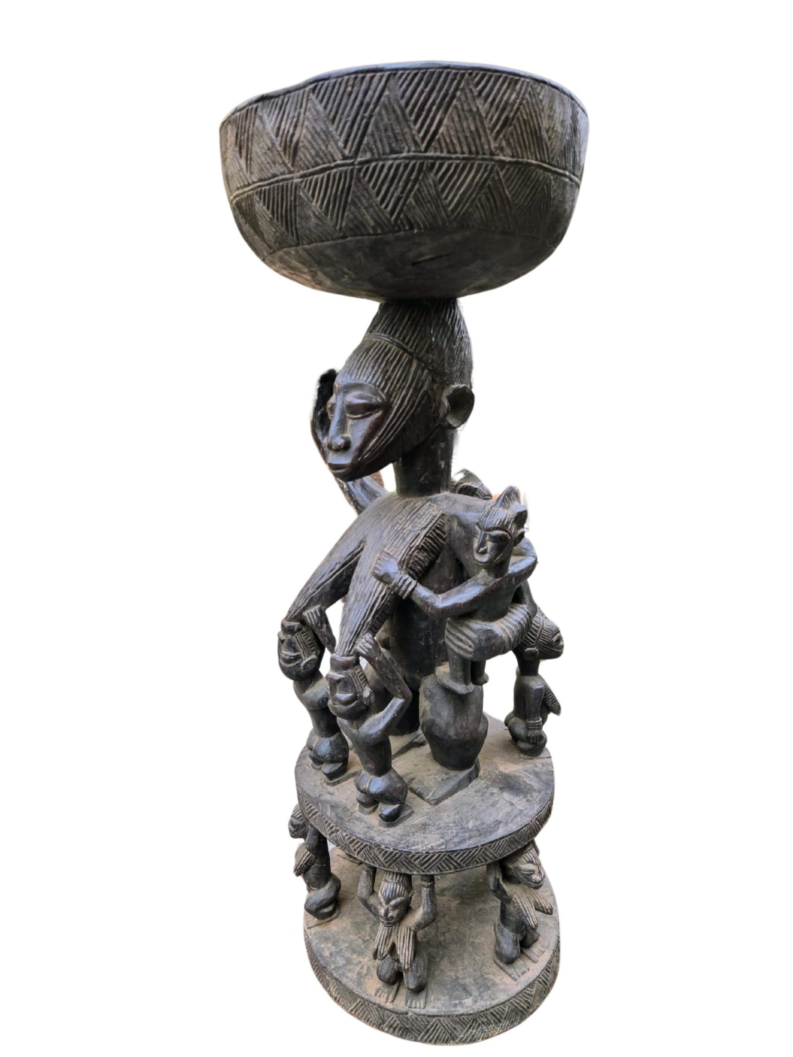 The bowl is the Olumeye, named for the female figure, "one who knows honor," that serves as a messenger to the spirits. It is carved from a single hardwood and features a kneeling figure, often a female Yoruba figure, except for royalty